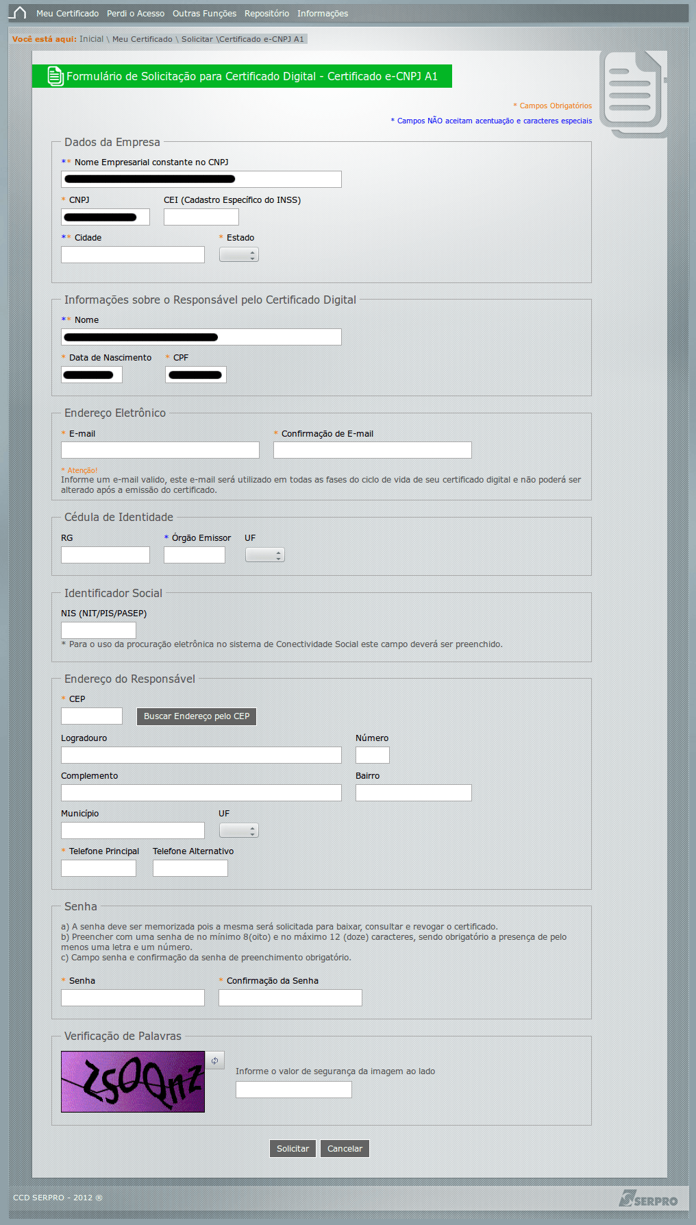 Preencha com atenção as demais informações da Empresa e do Responsável pelo Certificado Digital.