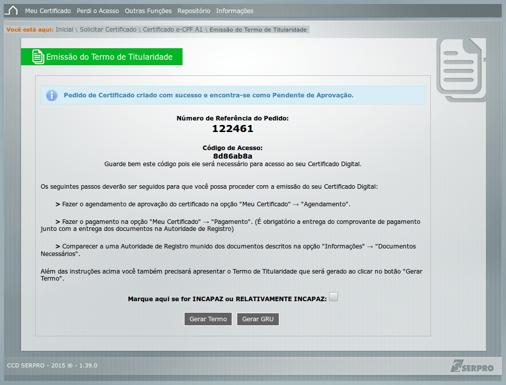 O Termo de Titularidade deverá ser assinado somente na presença do funcionário do Serpro no dia da entrega da documentação.