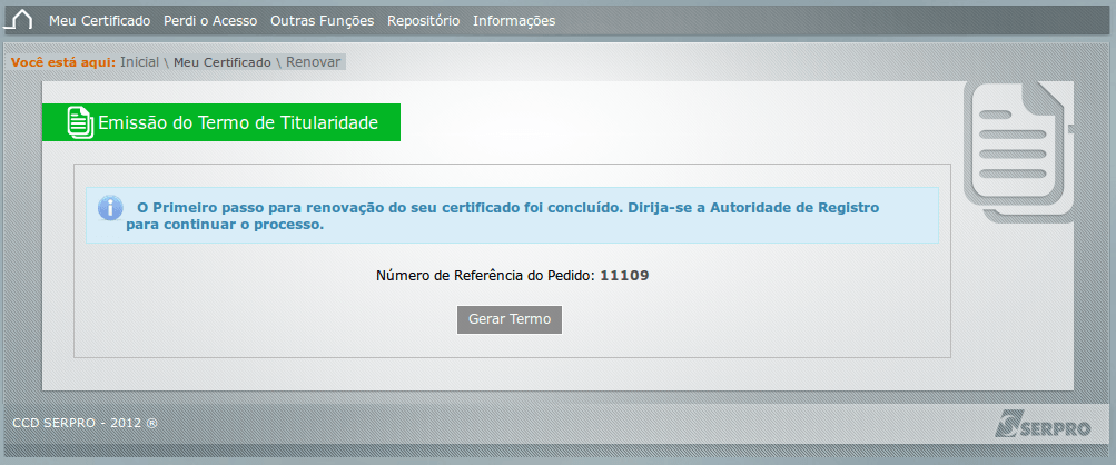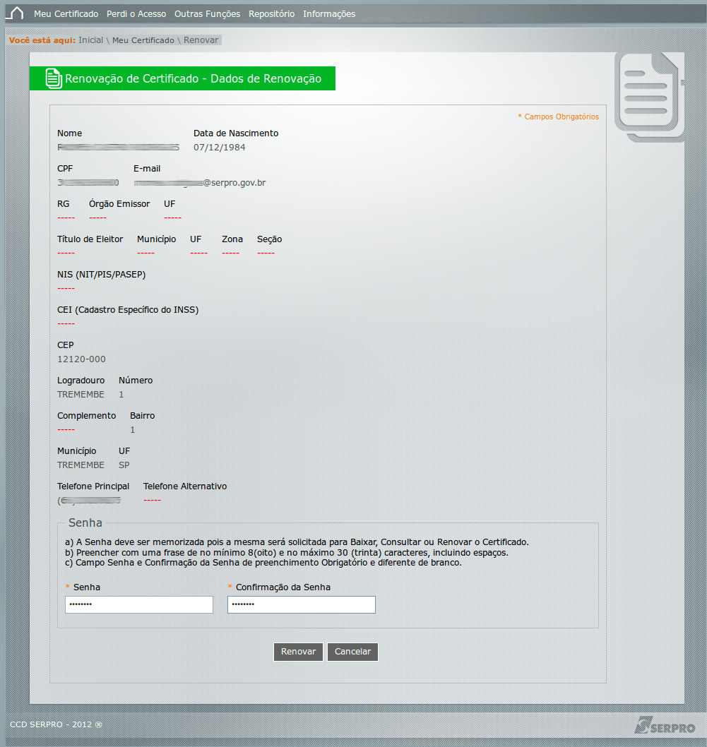 Caso alguma informação esteja incorreta ou desatualizada, o processo de renovação NÃO deverá ser realizado, pois o novo certificado sairá com as mesmas informações incorretas/desatualizadas.